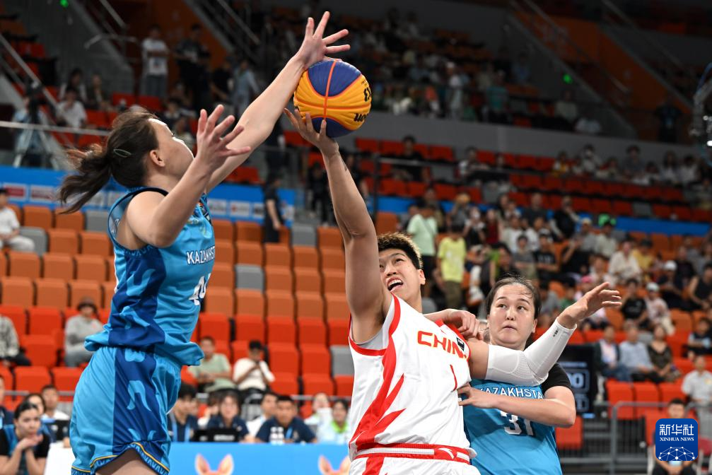 4月25日,哈萨克斯坦队球员莉娅·乌梅罗娃(前左)在比赛中突破。