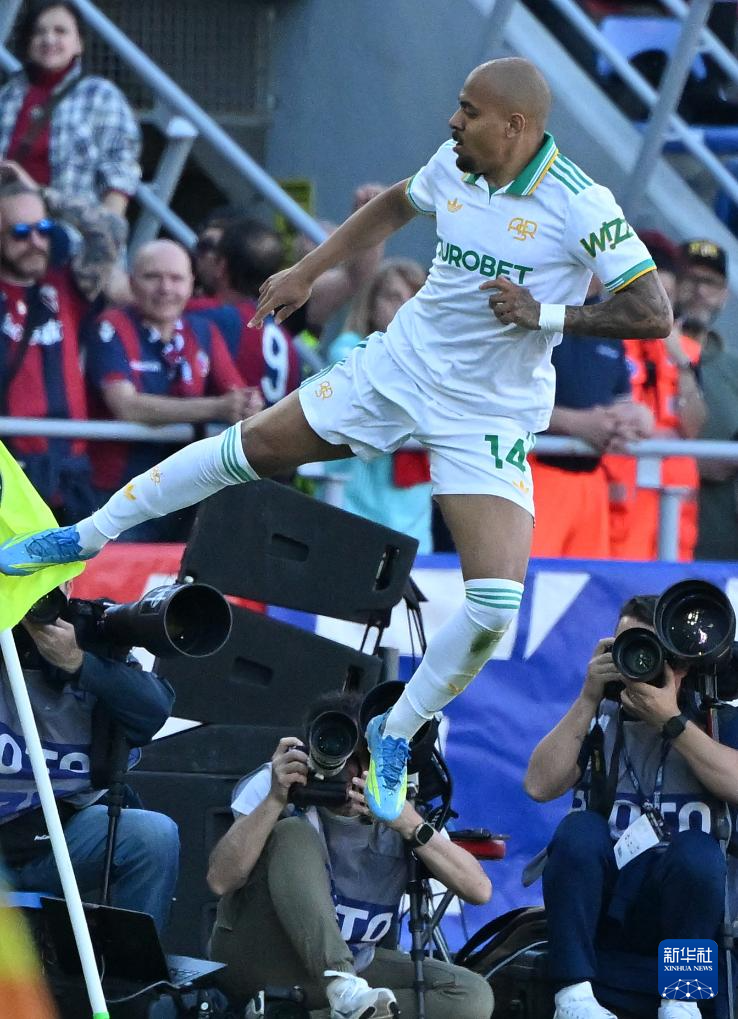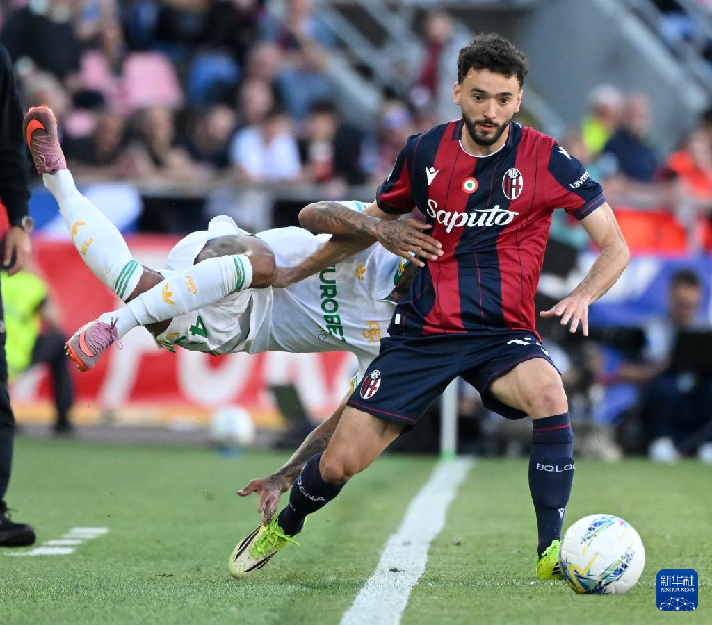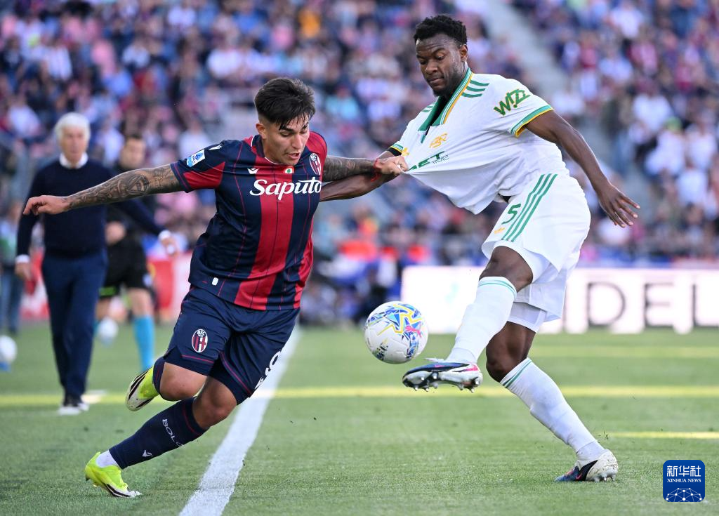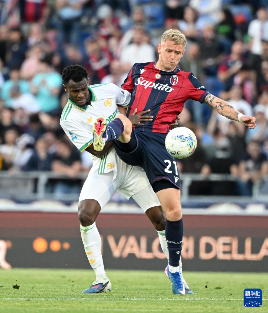 4月25日,罗马队球员韦斯利·利马(左)与博洛尼亚队球员若昂·马里奥在比赛中拼抢。