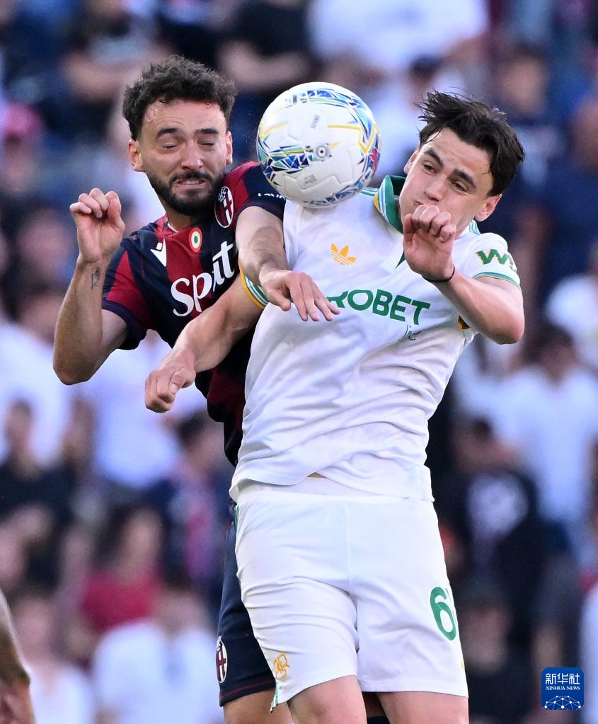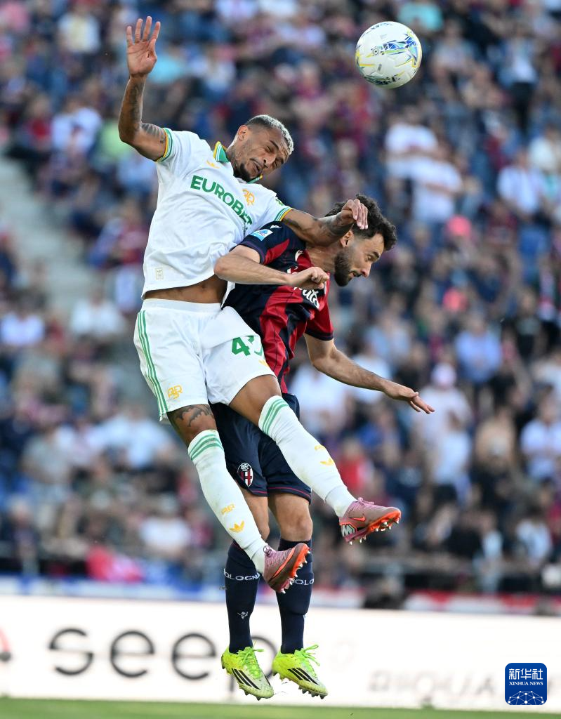 4月25日,罗马队球员韦斯利·利马(左)与博洛尼亚队球员若昂·马里奥在比赛中争顶。