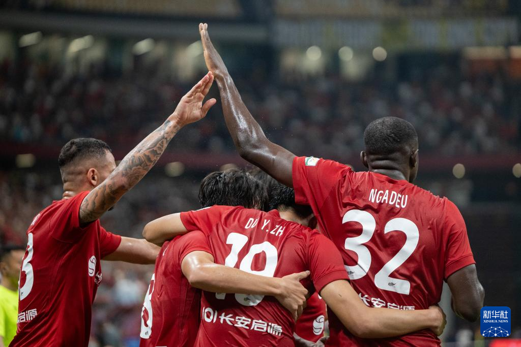 4月26日,重庆铜梁龙队球员在比赛中庆祝进球。