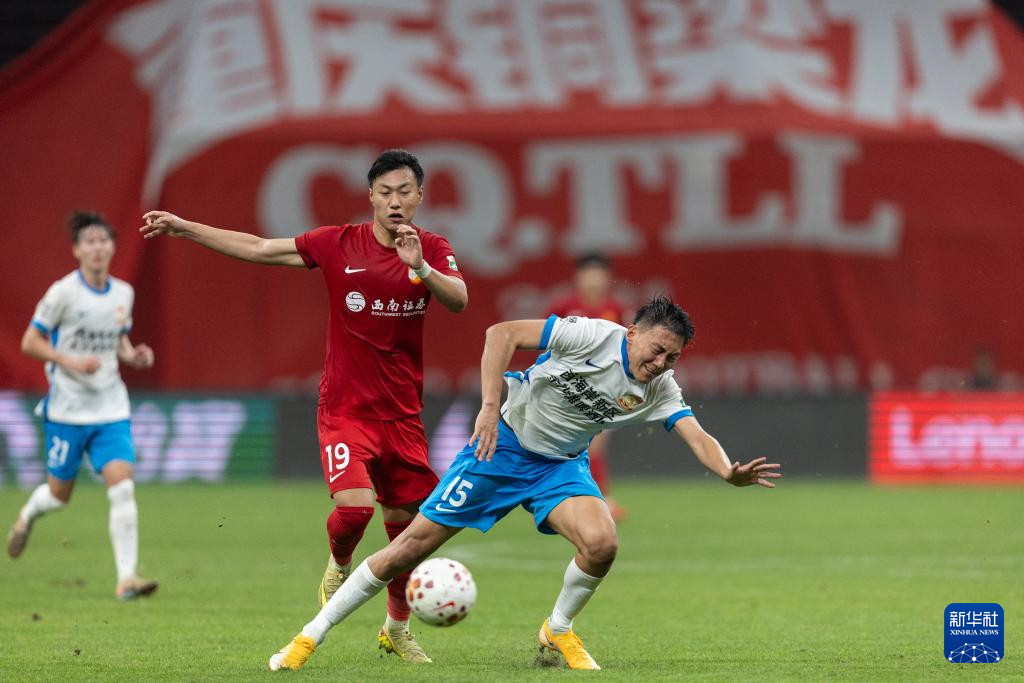 4月26日,重庆铜梁龙队球员陈纯新(左)与青岛西海岸队球员王庚睿在比赛中拼抢。