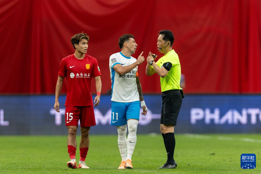 4月26日,青岛西海岸队球员戴维森(中)在比赛中和主裁判交流。