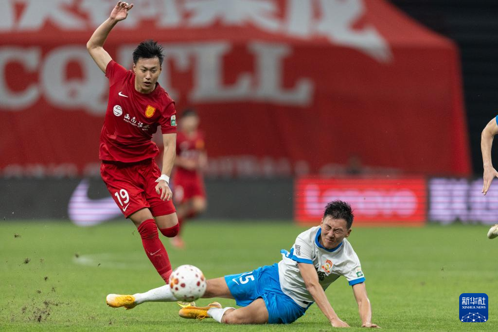 4月26日,青岛西海岸队球员王鹏(左)与重庆铜梁龙队球员向余望在比赛中拼抢。