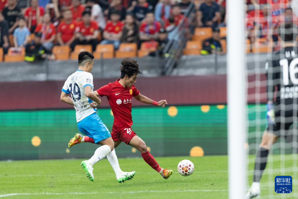 4月26日,重庆铜梁龙队球员和晓强(中)在比赛中射门。