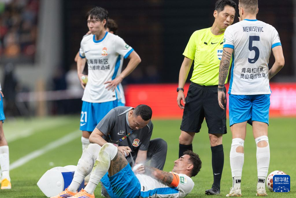 4月26日,青岛西海岸队球员戴维森(下)在比赛中受伤后接受治疗。