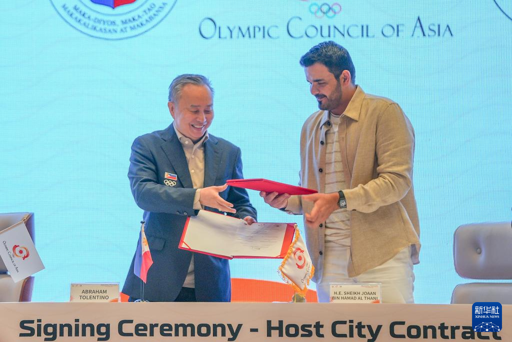 4月27日,亚奥理事会主席焦安亲王(右)、菲律宾奥委会主席亚伯拉罕·托伦蒂诺在签约仪式上交换合约文本。