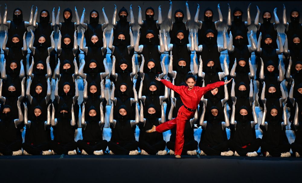 会徽照耀下,一座雪山从舞台中央隆起,一名杂技演员手足并用竖直向上攀登,把一根又一根铁杆高高垒起,在山岩的积雪里越扎越深,冒着呼啸的寒风展现出生命的不屈力量。在人们登顶成功的欢呼声中,年逾古稀的劳伦斯世界体育奖年度最佳体育时刻奖得主、“无腿登山家”夏伯渝昂首走进人群,小心翼翼地从胸口掏出2018年5月14日他登顶珠峰时所携带的国旗。