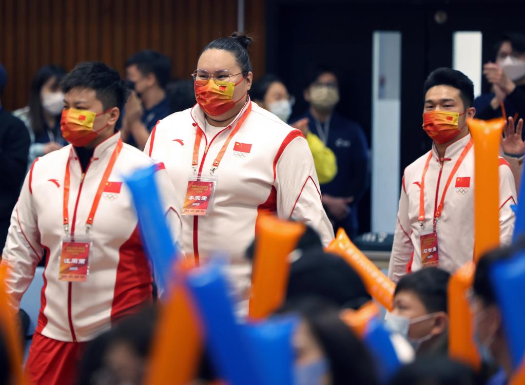 东京奥运会举重冠军汪周雨、李雯雯、石智勇(从左至右)抵达交流会现场。新华社记者 贾浩成 摄