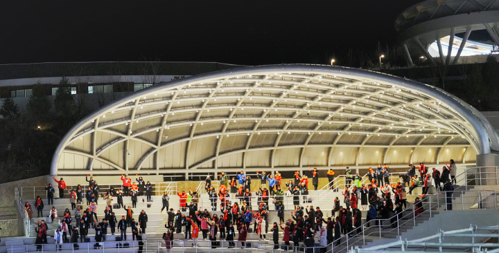 11月20日晚,观众在国家雪车雪橇中心观看“相约北京”2021-2022国际雪橇联合会雪橇世界杯比赛。北京市延庆区融媒体中心供图