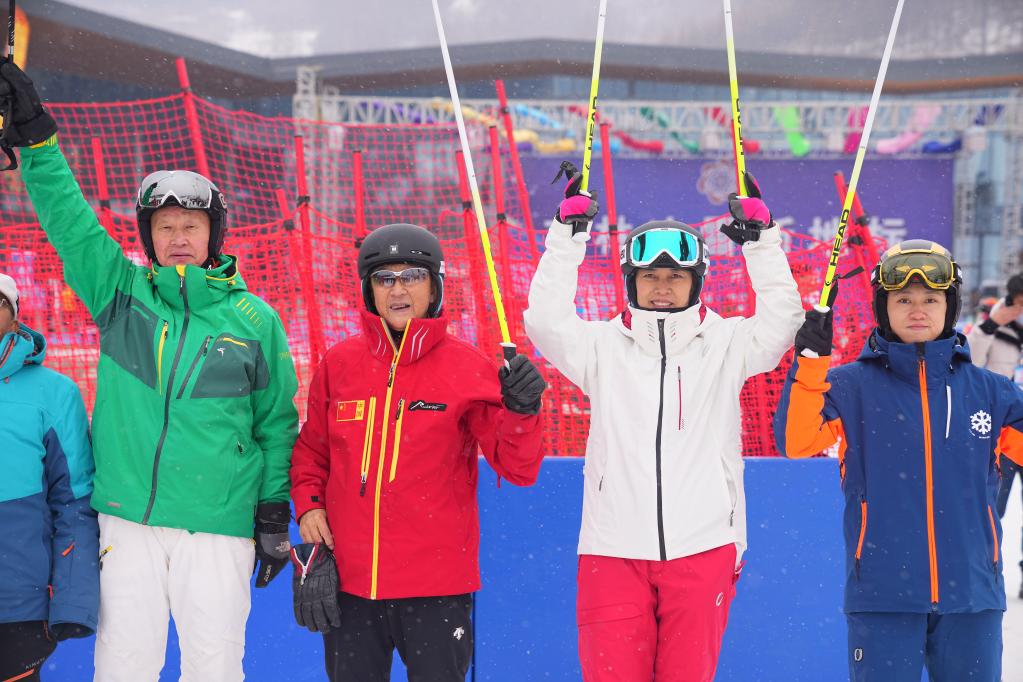 新中国第一位滑雪冠军单兆鉴(左二)、中国首批冬奥会选手朴东锡(左一)、第一届亚冬会越野滑雪冠军宋世纪(右二)、中国跳台滑雪冬奥最好成绩获得者常馨月(右一)四人在通化万峰滑雪场的合影。新华社记者 许畅摄