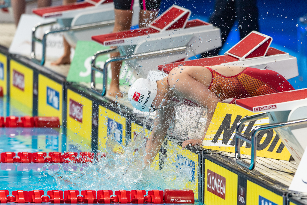 女子800米自由泳决赛,李冰洁是夺冠热门,她入水后就迅速取得领先,很快甩开其他选手一个身位以上,最终以8分02秒90的绝对优势率先触壁,夺得金牌,并且打破了世锦赛纪录。
