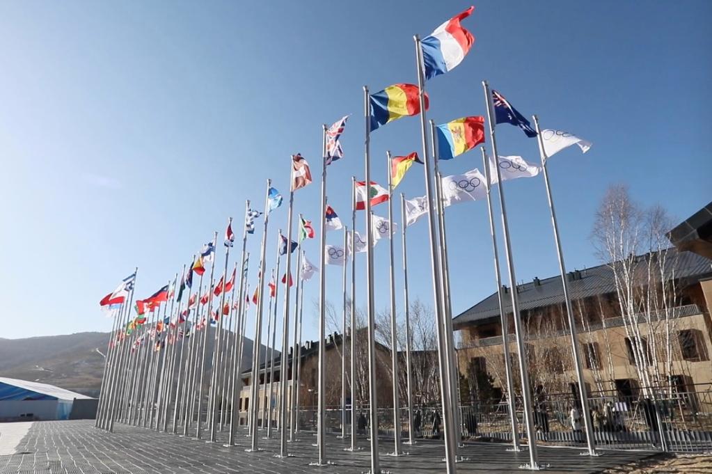 12月22日,张家口冬奥村村口飘起各参赛代表团旗帜。新华社记者 杨帆 摄