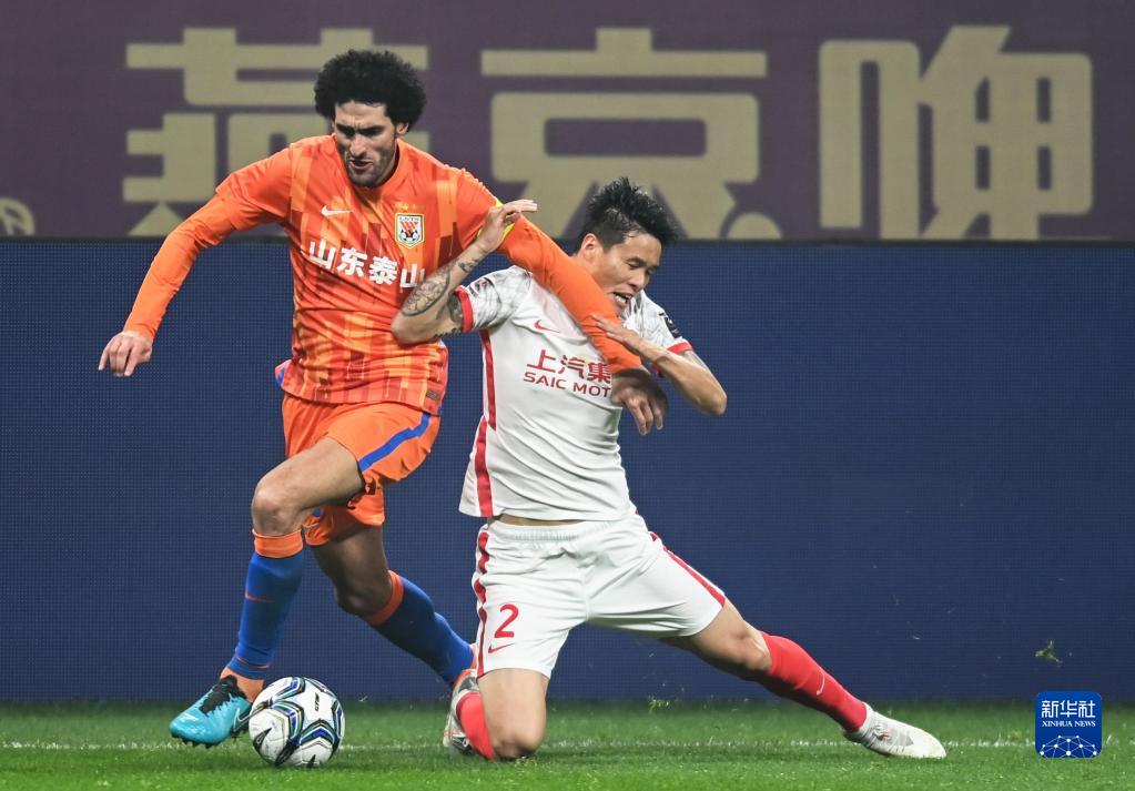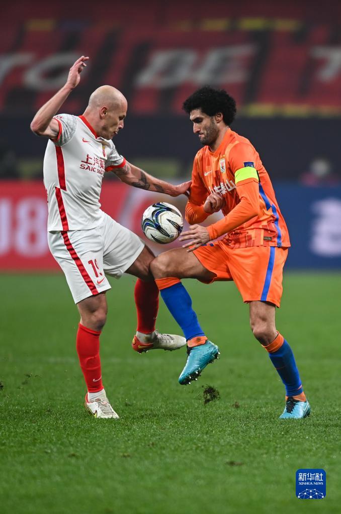 1月9日,山东泰山队球员费莱尼(右)与上海海港队球员亚伦·穆伊在比赛中拼抢。