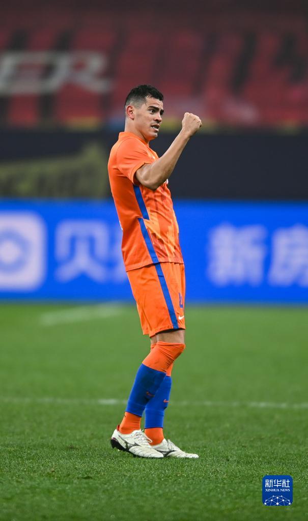 1月9日,山东泰山队球员贾德松在比赛中庆祝进球。