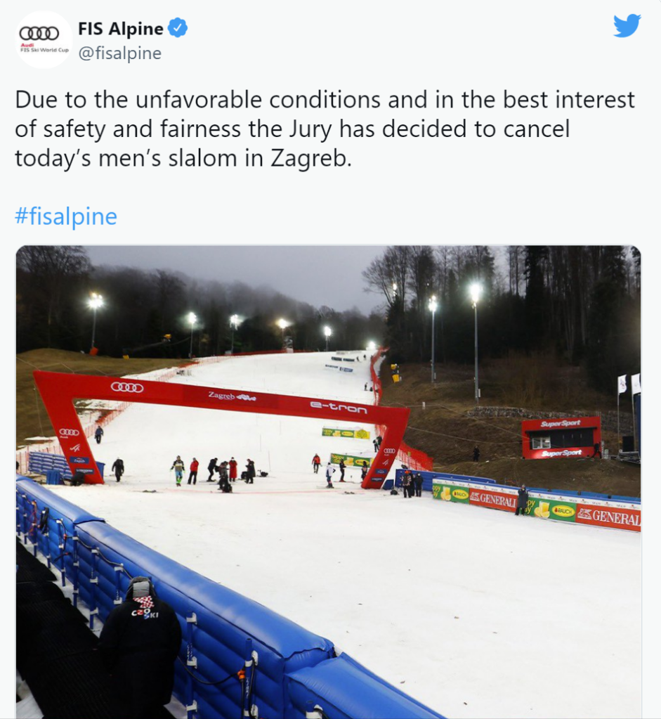 1月6日,国际雪联在其社交媒体官方账号上宣布取消萨格勒布的比赛