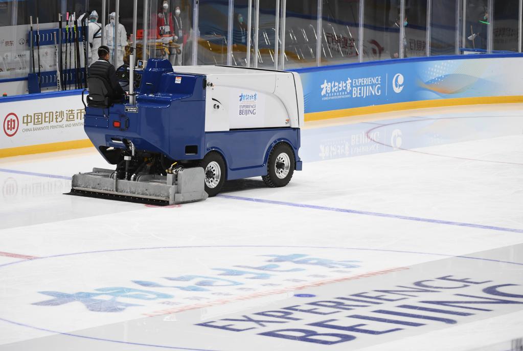 2021年11月13日,工作人员在“相约北京”冰球国内测试活动决赛间隙修整冰面。新华社记者张晨霖摄
