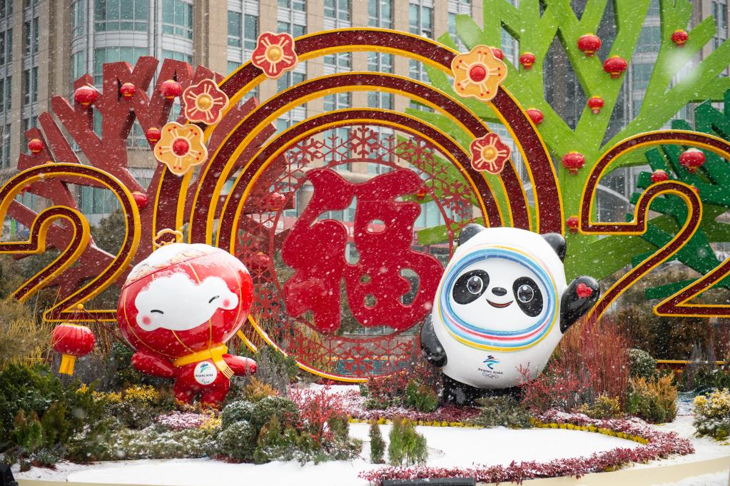 位于北京东单路口东北角的北京2022年冬奥会和冬残奥会吉祥物“冰墩墩”和“雪容融”。新华社记者陈钟昊摄