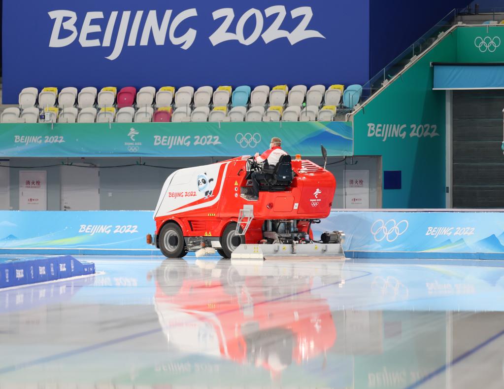 1月28日,国家速滑馆“冰丝带”正式对媒体开放,浇冰车在训练间隙进行浇冰作业。新华社记者 丁旭 摄