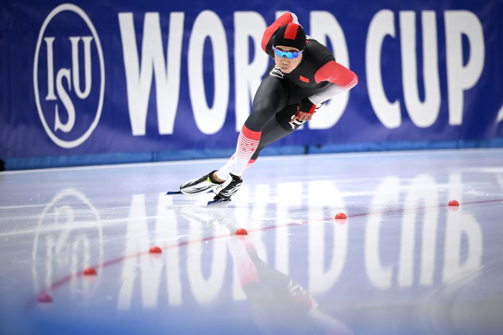 2021年11月12日,在波兰马佐夫舍地区托马舒夫举行的国际滑联速度滑冰世界杯男子500米A组决赛中,中国选手高亭宇获得冠军。新华社发(拉法尔摄)