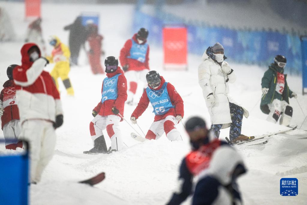 1月30日,参赛选手在雪上技巧项目训练中。当日,张家口赛区迎来瑞雪,参加北京冬奥会自由式滑雪雪上技巧项目的运动员在云顶滑雪公园进行了首次训练,备战日渐临近的比赛。新华社记者 肖艺九 摄