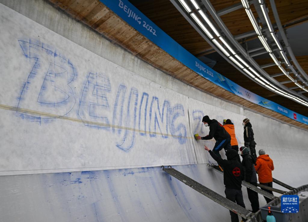 1月28日,在位于北京延庆的国家雪车雪橇中心,制冰师正在布置冰下景观。新华社记者孙非摄