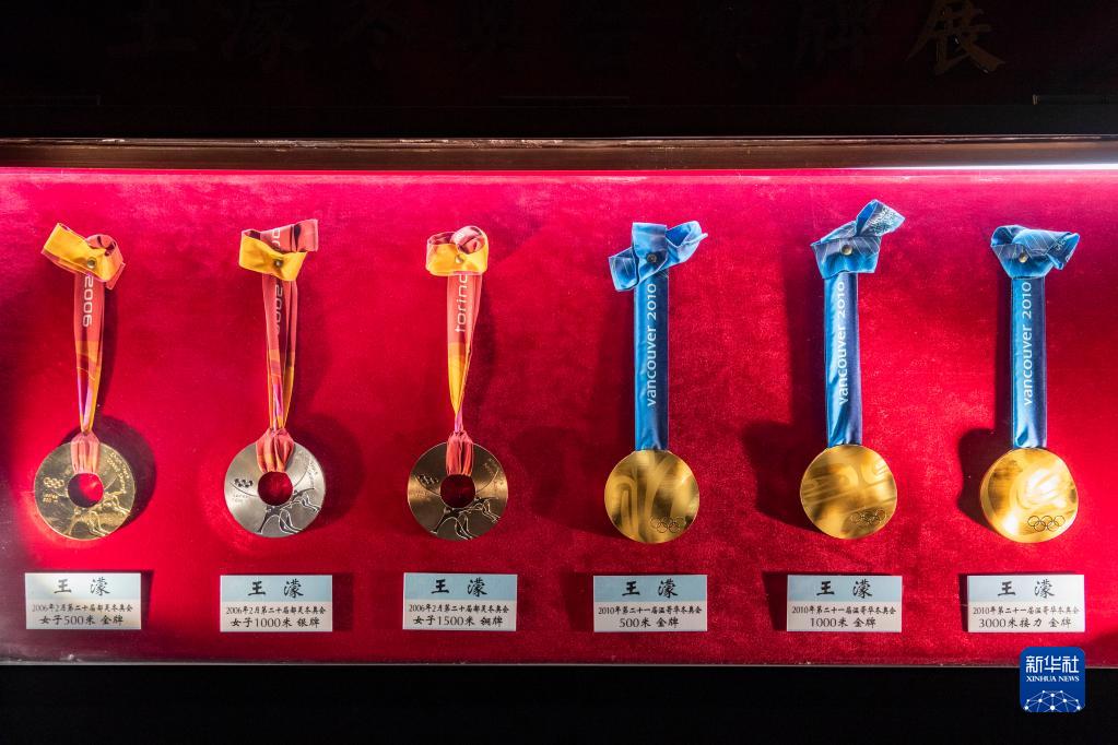 这是在七台河短道速滑冠军馆内拍摄的王濛在2006年都灵冬奥会和2010年温哥华冬奥会上获得的六枚奖牌,包括四枚金牌、一枚银牌和一枚铜牌。
