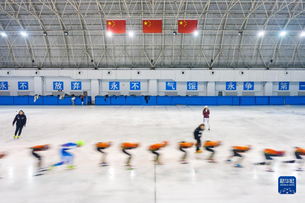 在七台河体育中心,七台河职业学院短道速滑训练中心的孩子们在进行训练。