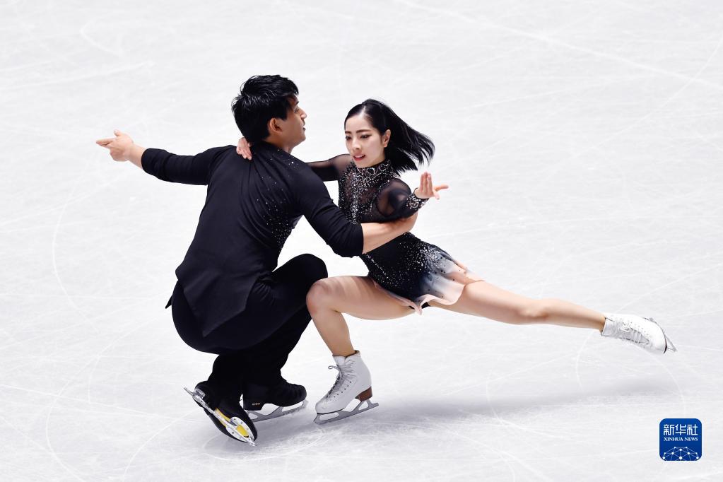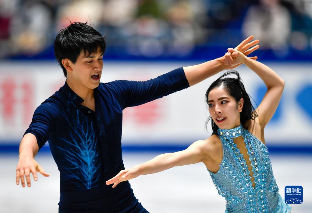 2021年11月12日,日本组合三浦璃来(右)/木原龙一在2021-2022赛季花样滑冰大奖赛日本站双人滑短节目比赛中。新华社记者张笑宇摄