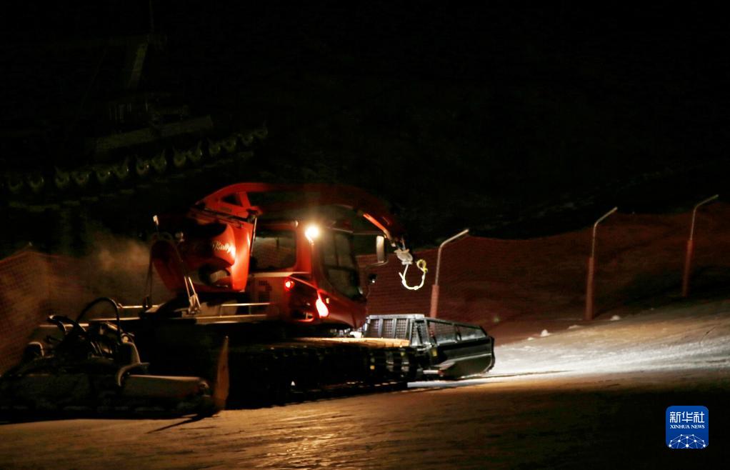 戎戈涛驾驶压雪车进行夜间雪道维护。新华社记者杨帆摄
