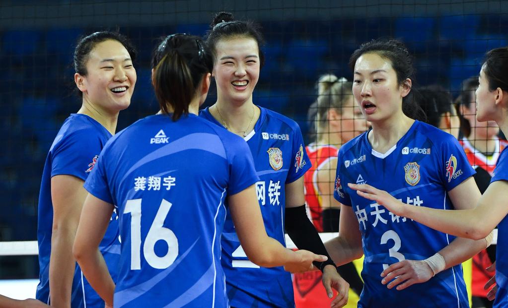2020年12月6日,江苏中天钢铁队球员张常宁(左三)在2020-2021赛季中国女子排球超级联赛中和队友庆祝得分。新华社记者 刘大伟 摄