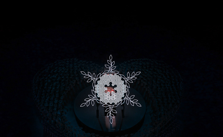 2月4日晚,北京冬奥会开幕式上,火炬手迪妮格尔·衣拉木江和赵嘉文准备将火炬嵌入“大雪花”中央。新华社记者陈益宸摄