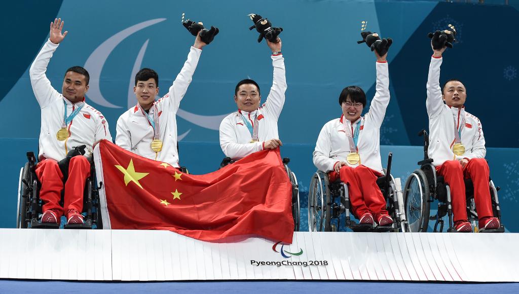 2018年3月17日,在平昌冬残奥会轮椅冰壶决赛中,中国队通过加时局以6:5险胜挪威队,夺得冠军。这是中国代表团在冬残奥会历史上获得的首枚奖牌。图为中国队队员王海涛、陈建新、刘微、王蒙、张强(从左至右)在平昌冬残奥会轮椅冰壶颁奖仪式上庆祝。新华社记者夏一方 摄