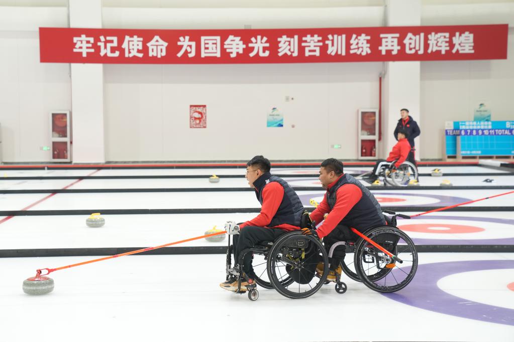 2021年12月23日,在北京顺义中国残疾人体育运动管理中心的国家残疾人冰上运动比赛训练馆,轮椅冰壶运动员们在投壶。新华社记者彭子洋 摄