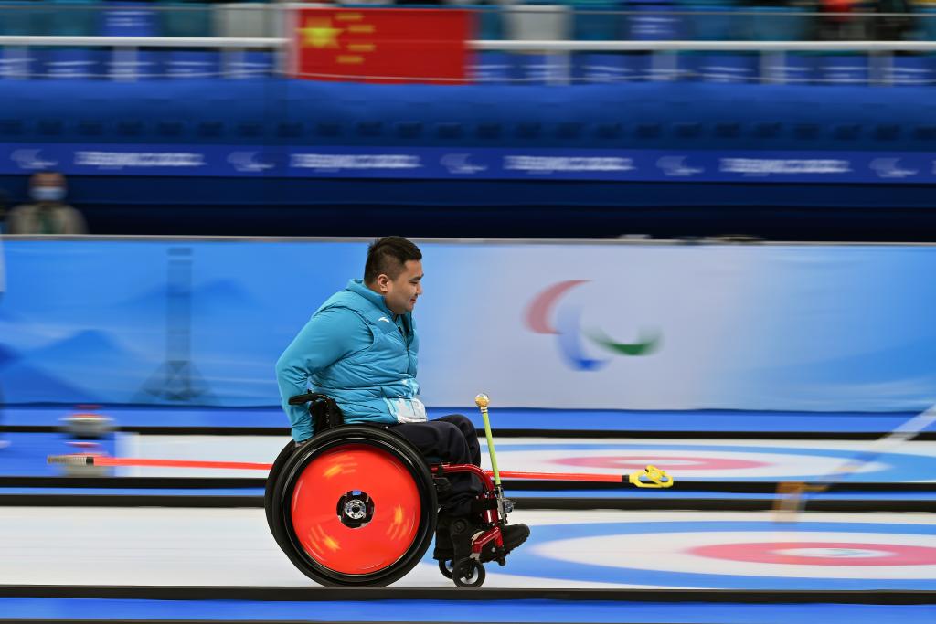 3月12日,2022年冬残奥会轮椅冰壶金牌赛中,王海涛在比赛中。新华社记者李尕 摄