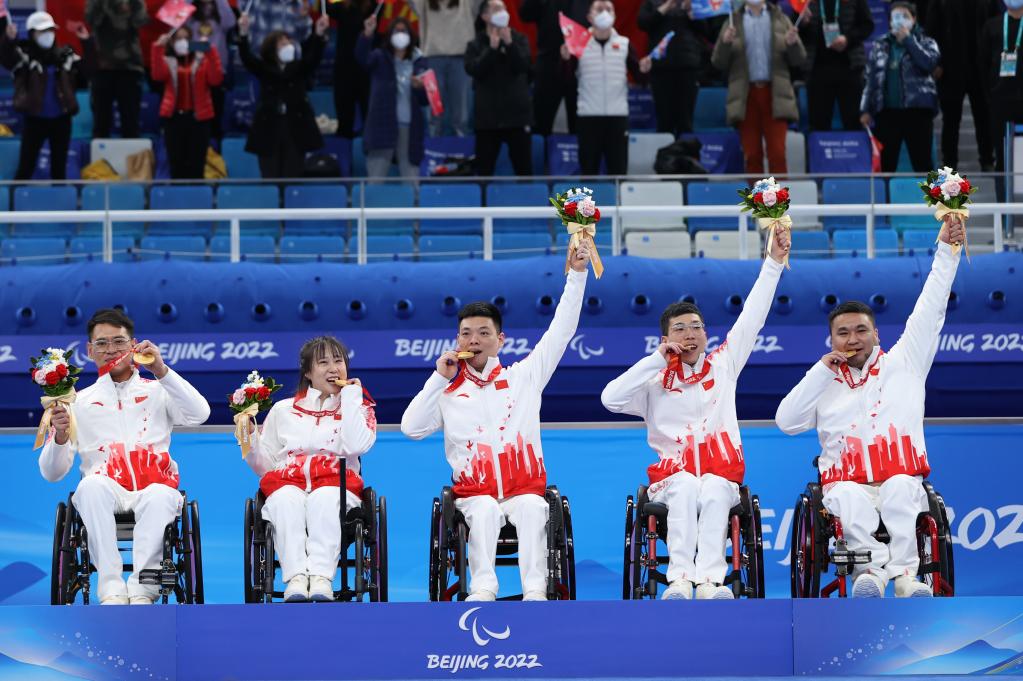 3月12日,2022年冬残奥会轮椅冰壶颁奖仪式,中国队选手孙玉龙、闫卓、张明亮、陈建新和王海涛(从左至右)庆祝胜利。新华社记者杜潇逸 摄