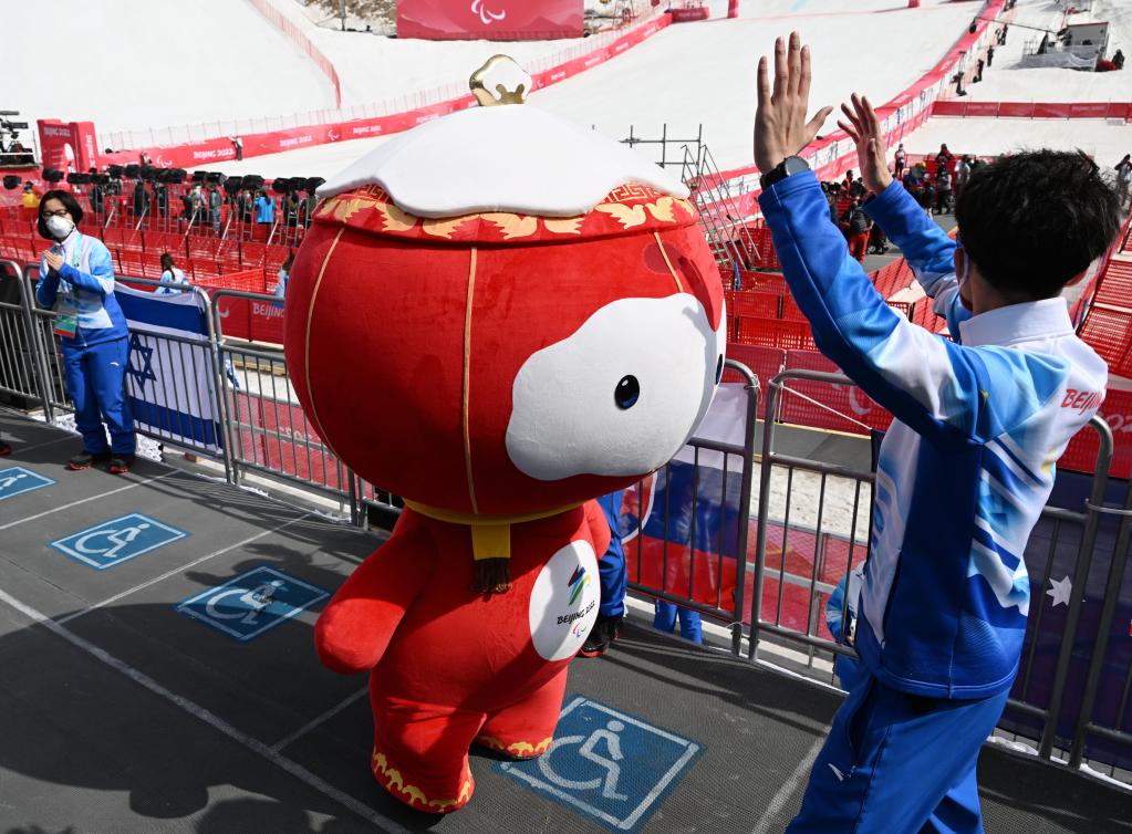 3月10日,在延庆国家高山滑雪中心,“雪容融”与志愿者互动。新华社记者张晨霖摄