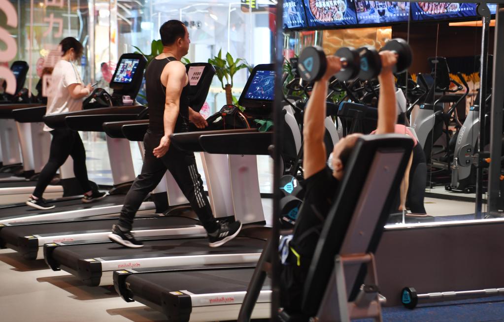 2021年1月21日,人们在新疆乌鲁木齐市嘉佑健身德港万达店内健身。新疆体育局体育产业发展中心在乌鲁木齐市以部分具有代表性的体育企业为试点,向广大群众发放体育消费券。新华社记者沙达提摄