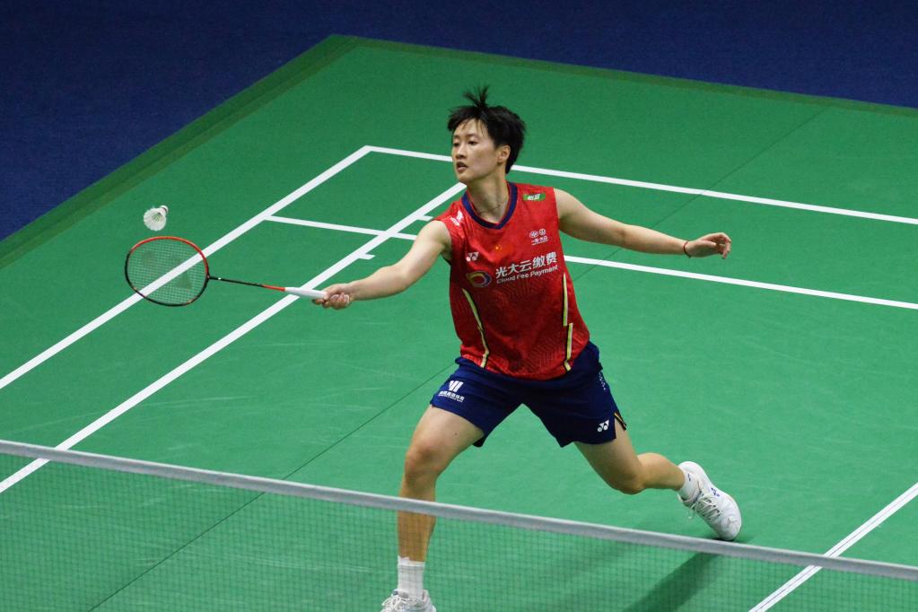 率先进行的第一单打比赛由奥运冠军陈雨菲迎战安洗莹。首局陈雨菲一度取得领先,但随后被对手赶超,以17:21先失一局。第二局,陈雨菲在落后情况下反超,以21:15扳平。决胜局,陈雨菲长时间处于下风,且因脚踝扭伤在5:10落后时请求接受治疗。安洗莹随后也出现了抽筋的状况,但在比分上一直压制陈雨菲并以20:17率先逼近胜利。但陈雨菲并未放弃,杀球频频得分,最终以22:20顽强逆转,为中国队拿下第一分。