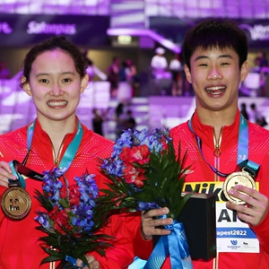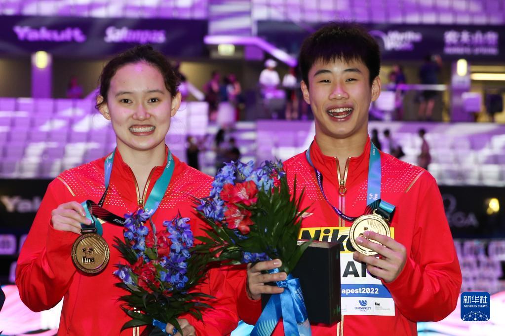 当日,在匈牙利布达佩斯举行的2022年世界游泳锦标赛跳水项目混双10米台决赛中,中国选手任茜/段宇获得冠军。新华社记者 郑焕松 摄