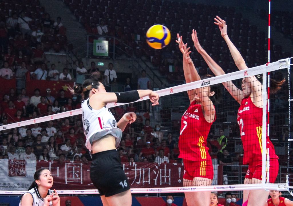 7月3日,中国女排以3:1击败韩国队。图为中国队球员李盈莹(右一)与王媛媛(右二)在比赛中拦网。新华社发(德拉加诺夫摄)