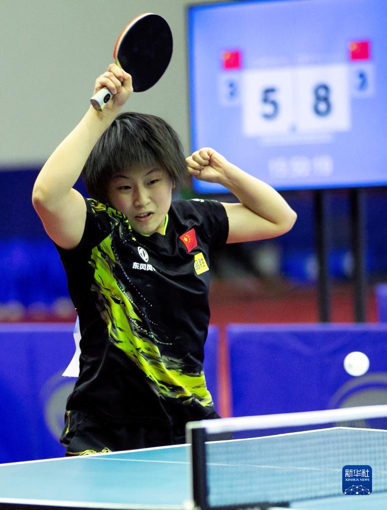 9月6日,中国选手覃予萱在U19女子单打决赛中回球,最终她以4比3战胜队友陈熠,夺得冠军。新华社发(凯乔 摄)