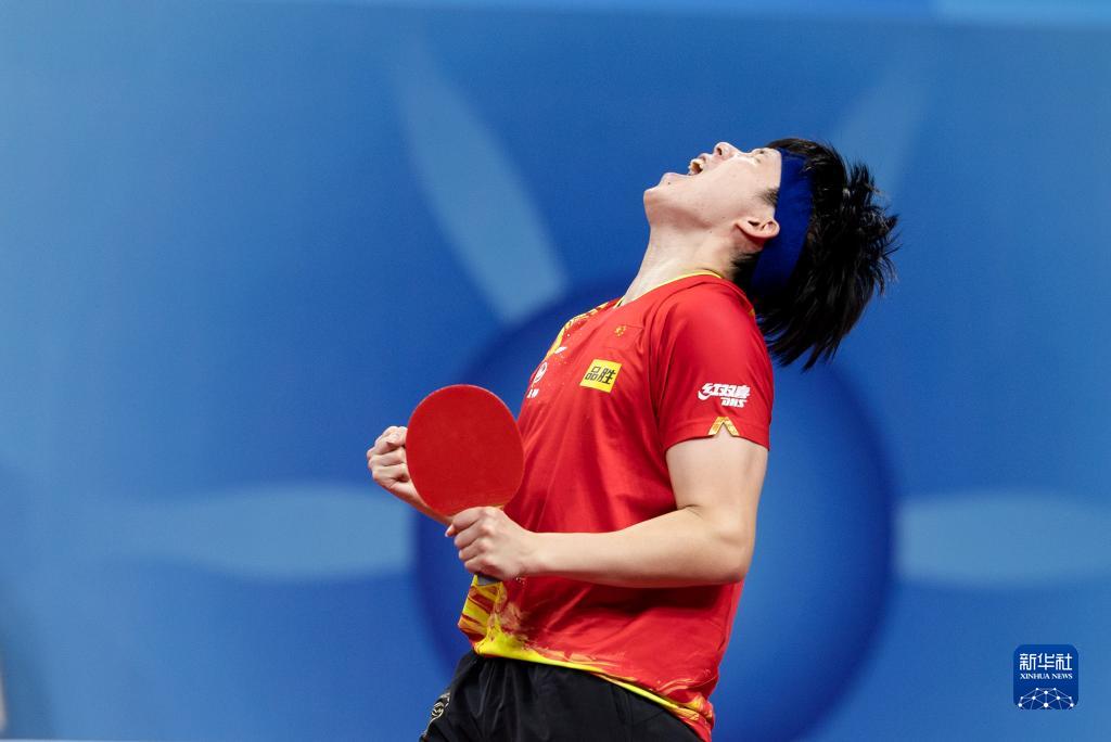 10月7日,中国队选手王楚钦在获胜后庆祝,他以3比2战胜瑞典队选手克里斯蒂安·卡尔森。新华社记者 江宏景 摄