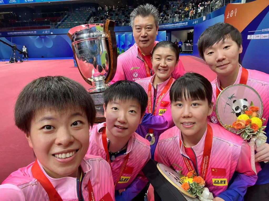 获得冠军后,参加此次世乒赛的五位国乒女将和李隼紧紧拥抱在一起。“今天当国歌奏响、国旗升起的时候,我就想起了去年东京奥运会的一幕,这一刻(感到)特别自豪和骄傲,真的很美好。”孙颖莎说。
