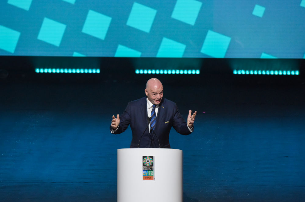 ↑这是国际足联主席因凡蒂诺在抽签仪式现场发言。新华社记者郭磊摄