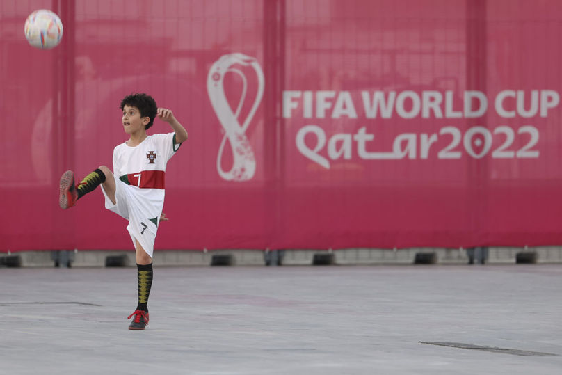 卡塔尔世界杯临近,多哈街头的氛围渐浓,图为11月8日,一名男孩在多哈瓦基夫市场的空地上踢球。新华社记者李明摄