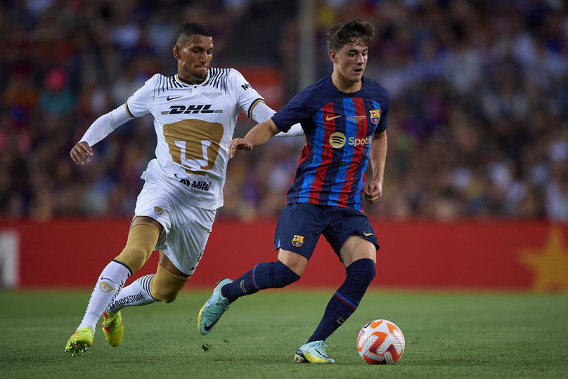 8月7日,在2022年甘伯杯足球赛中,效力于巴塞罗那队的加维(右)与美洲狮队球员梅里唐在比赛中拼抢。新华社发(帕布罗·莫拉诺摄)