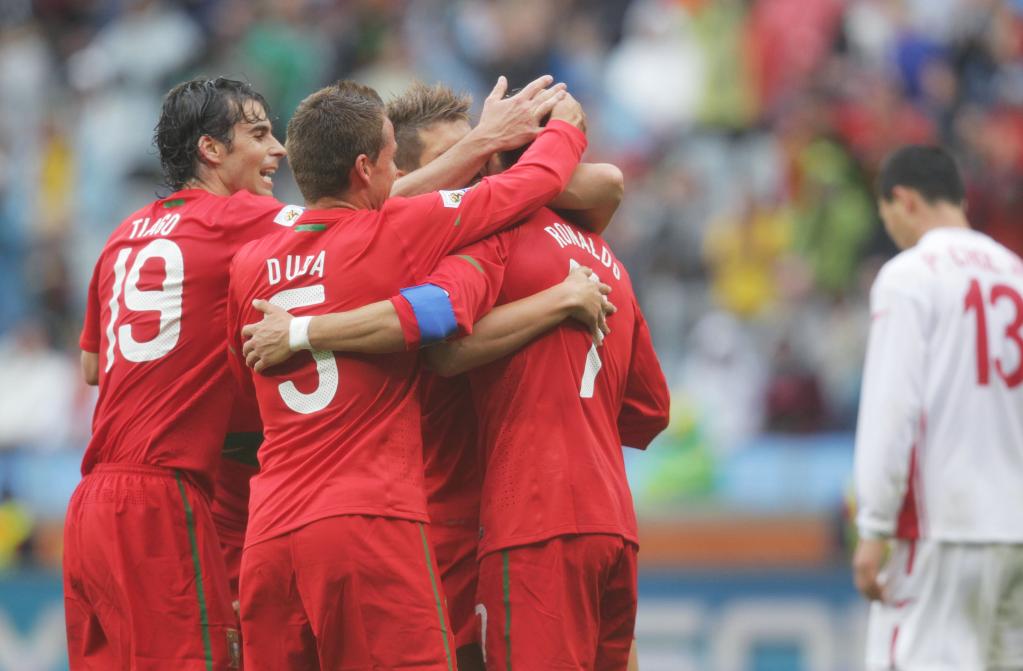 2010年6月21日,在南非世界杯葡萄牙队7:0战胜朝鲜队的比赛中,C罗(右二)进球后与队友庆祝。新华社记者邢广利摄