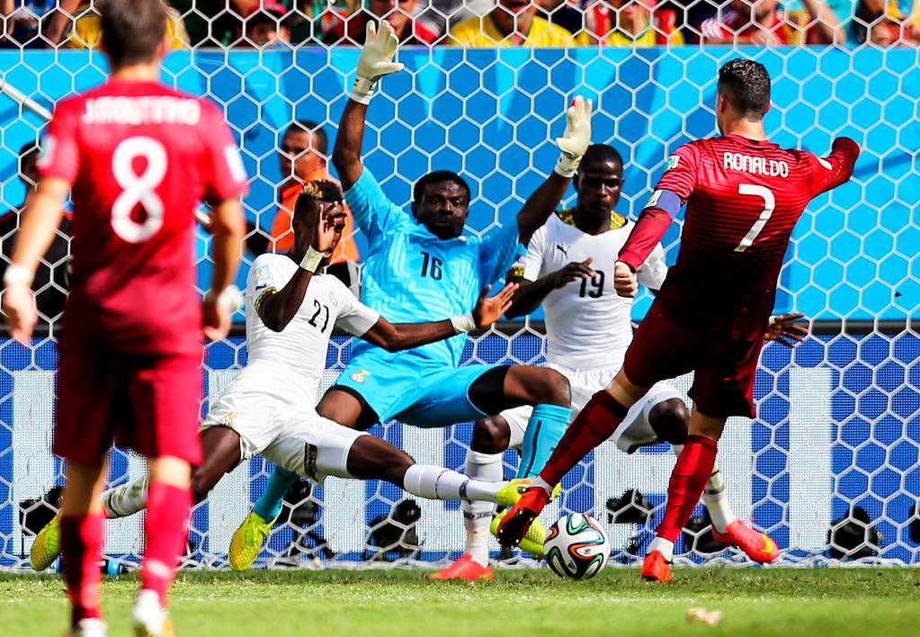 2014年6月26日,在巴西世界杯葡萄牙队2:1战胜加纳队的比赛中,C罗(右)攻入致胜一球。