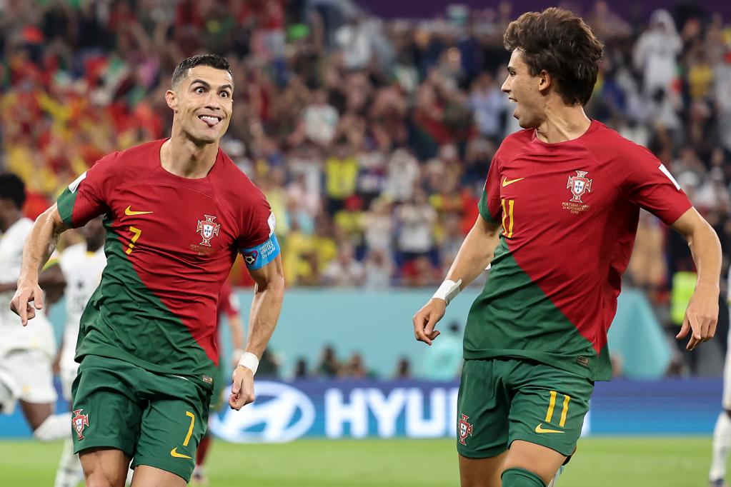 11月24日,在卡塔尔世界杯葡萄牙队3:2战胜加纳队的比赛中,C罗(左)在主罚点球破门后庆祝。新华社记者曹灿摄