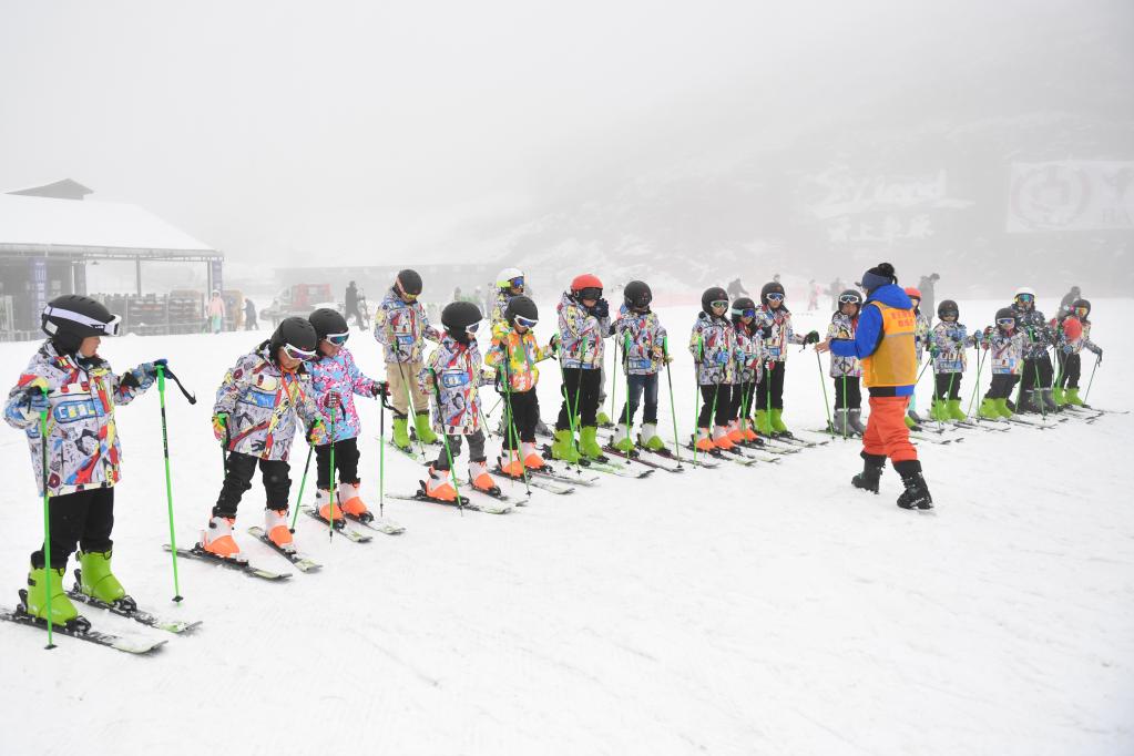 ↑2022年1月9日,浙江省湖州市安吉县山川小学学生在云上草原滑雪场练习滑雪。